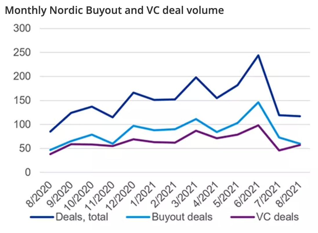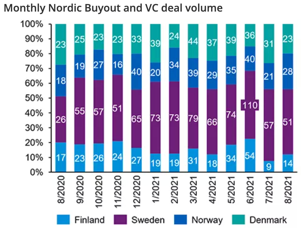 From the second graph, we’ve got to note that it includes both Buyout and VC deals. Sweden is consistently the largest chunk in the mix, most likely anyways even if buyout data was taken out. Surprisingly, Finland is lagging quite a bit in the last two months compared to Sweden and Norway.