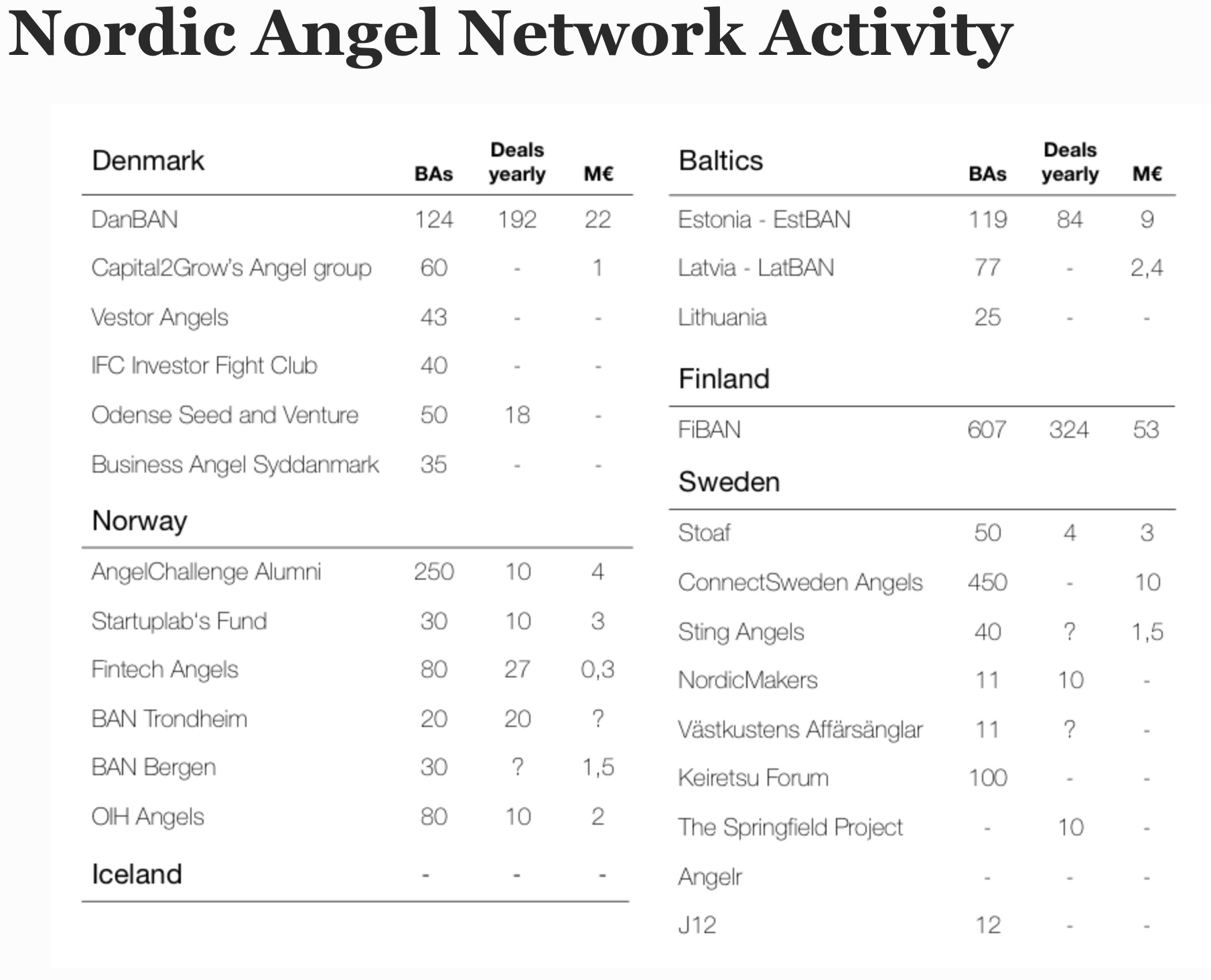 According to NordicBAN, there are quite a few angel networks in the Nordics. These networks under NordicBAN all together gather around 2 000 angel investors & a list gathered from these people would be an interesting read.